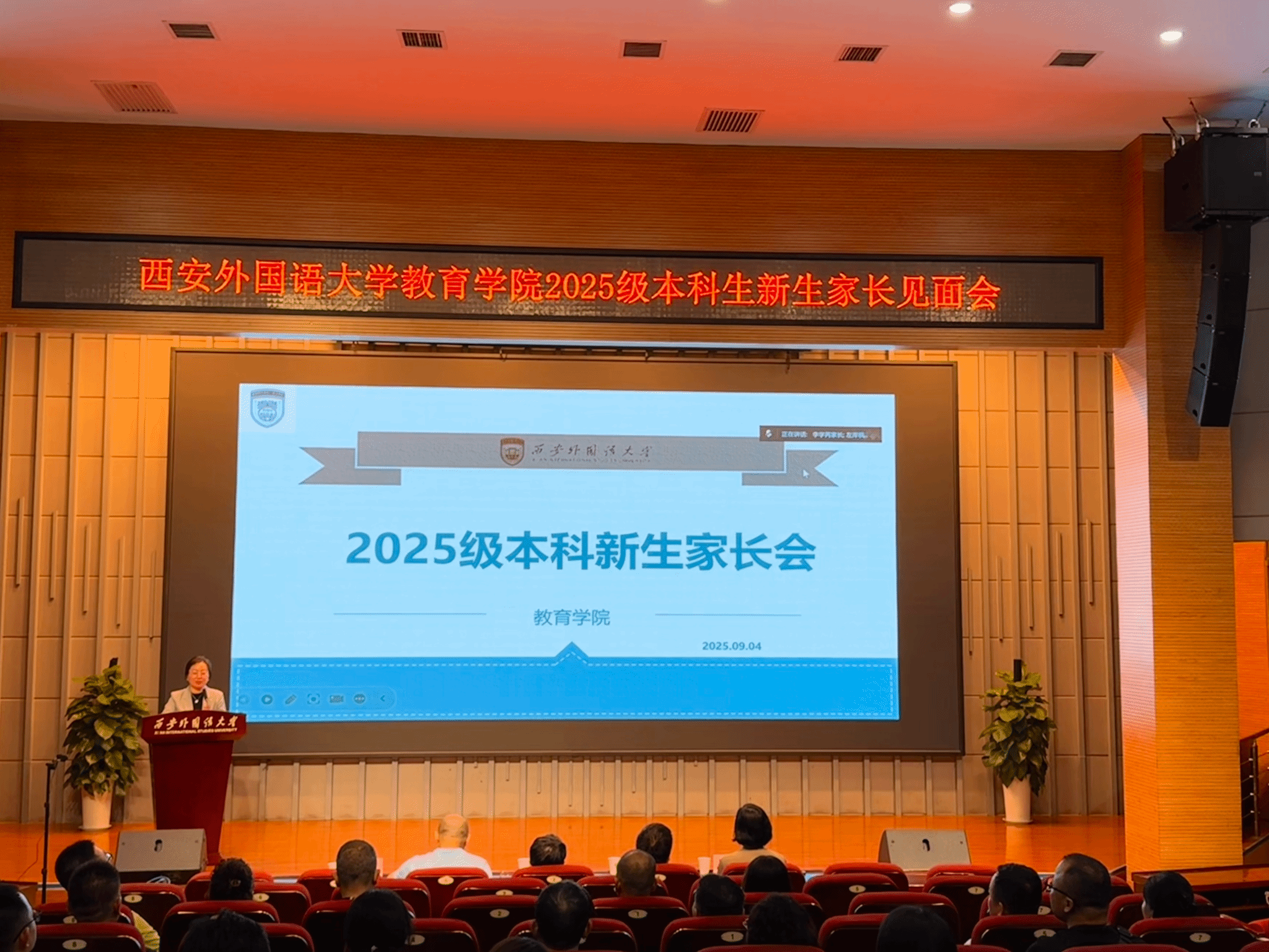 2025年9月4日晚,西安外国语大学教育学院在JA111报告厅组织召开2025级本科新生家长会。教育学院党委书记沈磊、副院长高岩(主持行政工作)、党委副书记刘一静、副院长王嘉铭及2025级本科生辅导员王封青出席会议,2025级本科新生家长通过线上、线下方式参加会议,会议由党委副书记刘一静主持。